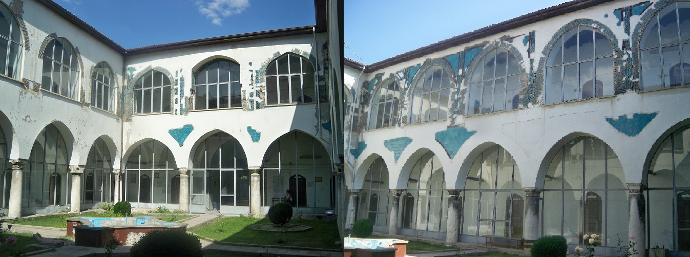 Batı duvar ekseninde yer alan eyvanın üç duvarında da dikdörtgen biçimli nişler yer almaktadır. Avlu kalıntılarından yoğun bir çini kullanıldığı anlaşılmaktadır. Çinilerde geometrik, bitkisel ve yazı olmak üzere üç farklı motif vardır. Eyvanın iç duvarlarına, firuze renkli altıgen çini; panoların arasına, mor renkli üçgen şeklinde çiniler yerleştirilmiştir.