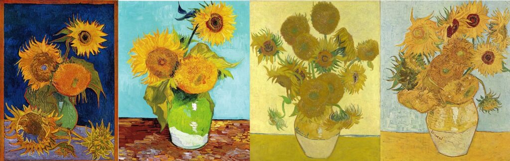 Vincent Van Gogh’un Ayçiçekleri serisi en ünlü eserleri arasındadır. Bunlardan iki tanesi Paris’te 1887’de yapılmış olup yerde yatan ayçiçeklerini; ikinci seri ise 1888–1889 yıllarında Arles’te yani Fransa’nın güneyindeki “Sarı Ev”de yaptığı vazodaki ayçiçeklerini tasvir eder. Van Gogh, 1888’de Arles serisinin farklı çiçek düzenlemeleri ve farklı arka planlarla dört versiyonunu yapar. İlk versiyon için turkuaz, ikinci versiyon için lacivert, üçüncü versiyon için mavi-yeşil ve dördüncü versiyon için sarı kullanır. Bu sefer çiçekler bir vazonun içinde, yaşamın farklı evrelerini temsil edecek biçimde betimlenir.